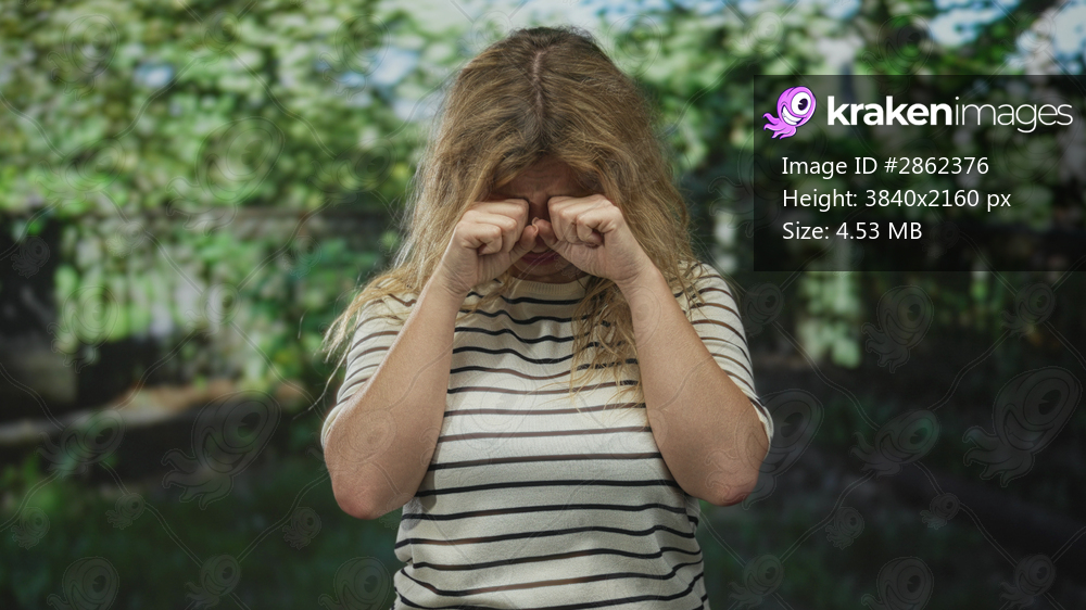 Young blonde woman standing in a forest pressing temples with both hands beneath bright green foliage; anxiety headache fatigue.