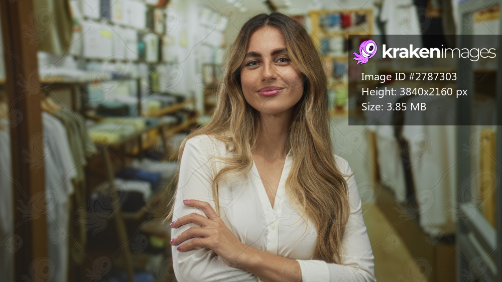 Young blonde woman stands with arms crossed in a boutique clothing shop aisle; confidence determination poise.