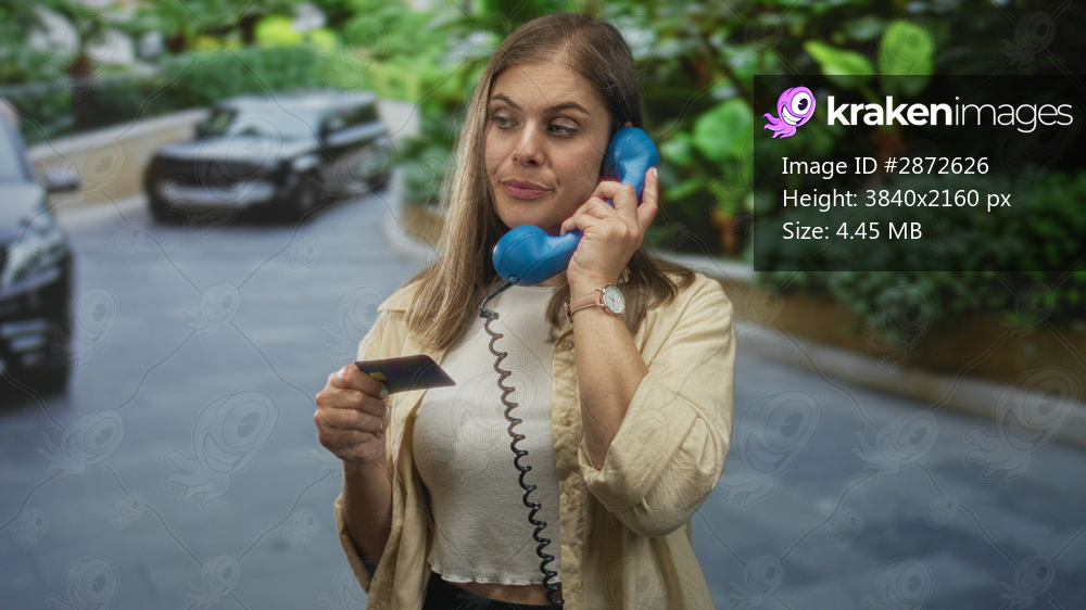 Young blonde woman stands on city street holding blue handset and examining creditcard with hand visible; uncertainty.