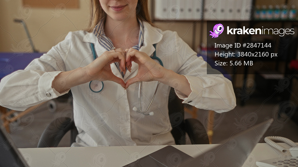 Young blonde woman with stethoscope forming heart shape with hands in building; love care compassion.