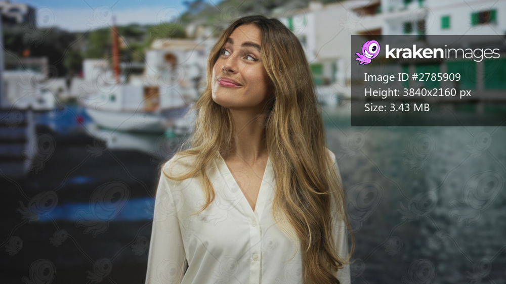 Young blonde woman sticks out tongue with tilted head at marina showing loose waves in hair; playfulness joy.