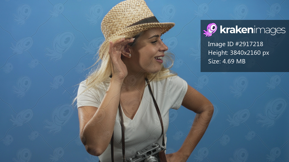 Young blonde woman with straw hat and vintage camera holding hand to ear in studio with blue backdrop; playful curiosity.