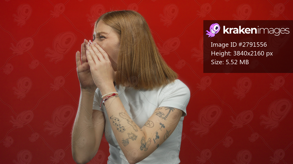 Young blonde woman with tattoos shouting enthusiastically against an isolated vibrant red wall wearing a white shirt and bracelets.