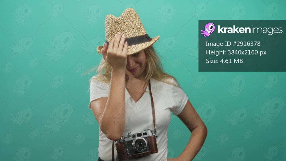 Young blonde woman tipping straw hat with hand and wearing vintage camera in teal studio; playful wanderlust.