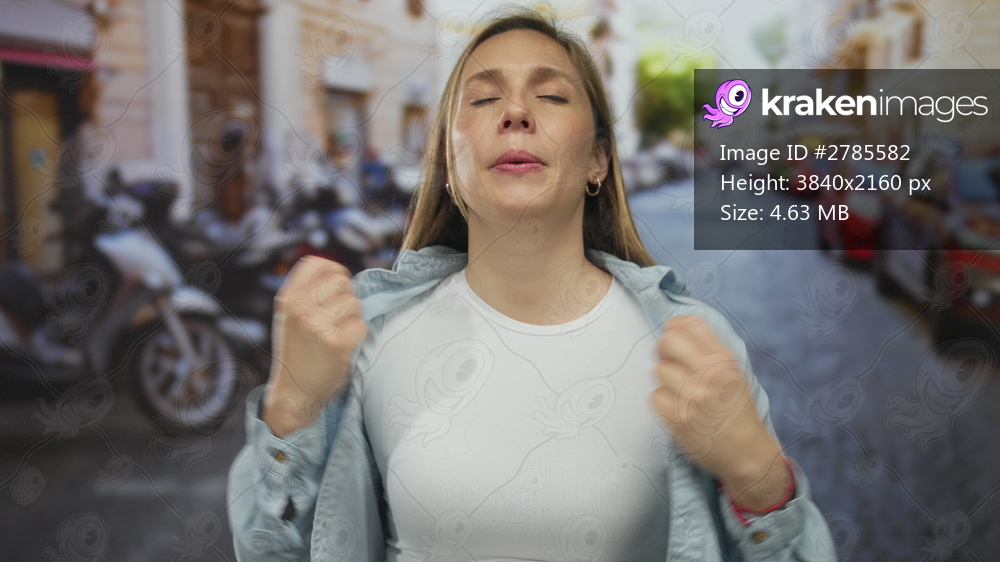 Young blonde woman touches neck and chest on urban street; heat fatigue.