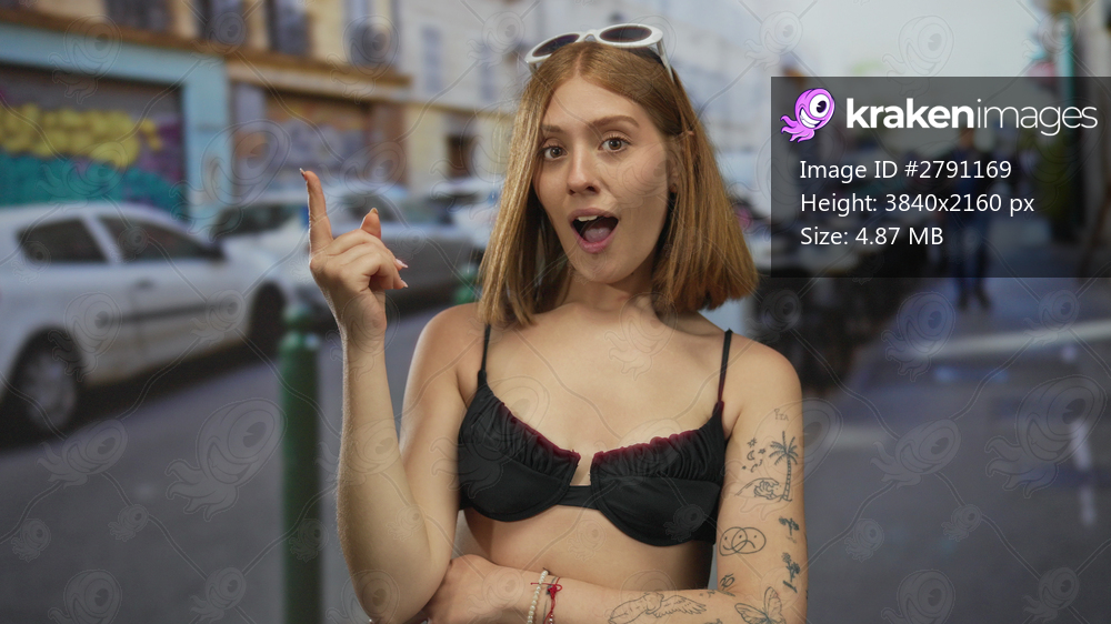 Young blonde woman touching hair gently on urban street corner near cafe tables; thinking idea inspiration