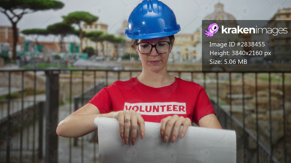 Young blonde woman volunteer in blue hardhat and glasses unrolls white blueprint with bare hands at building near roman ruins; dedication.