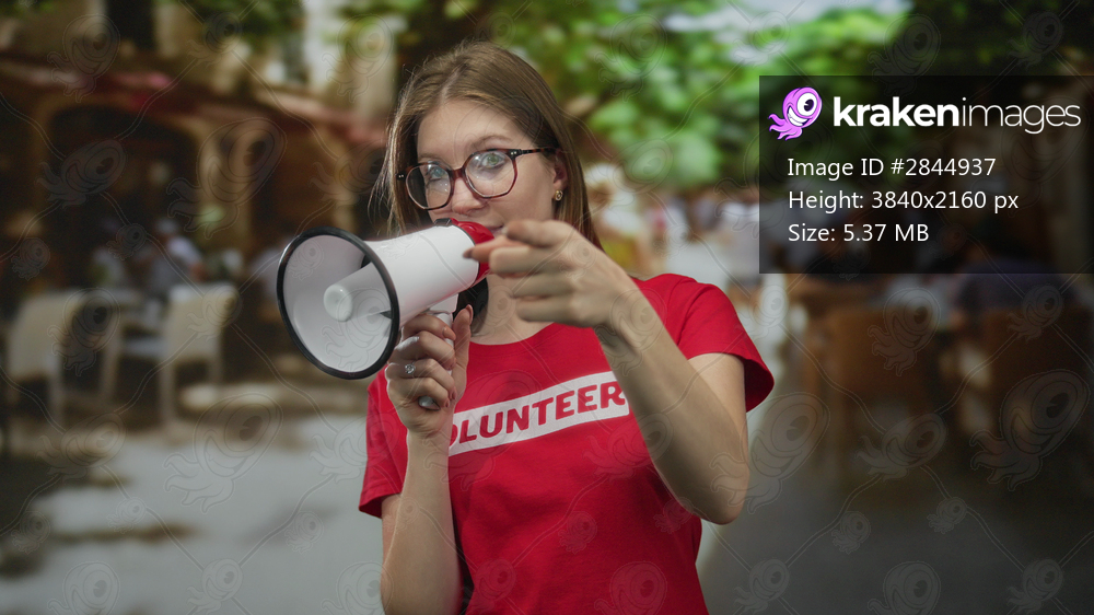 Young blonde woman volunteer in red shirt holding megaphone and pointing finger on street terrace; empowerment.