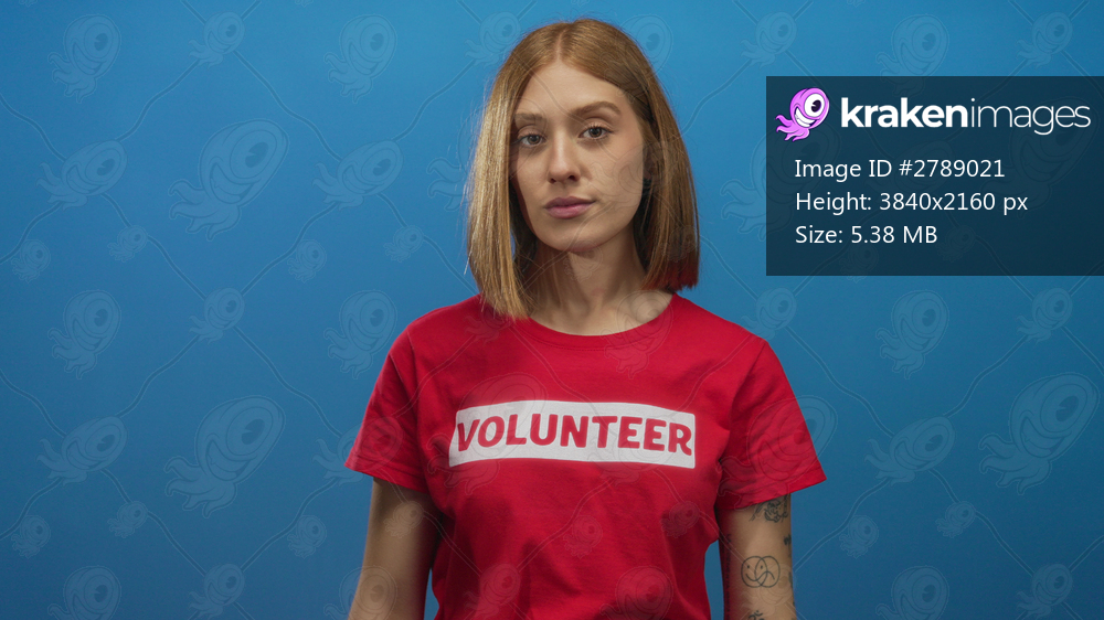 Young blonde woman volunteer in red shirt stands confidently against isolated blue background wall conveying community spirit and altruism.