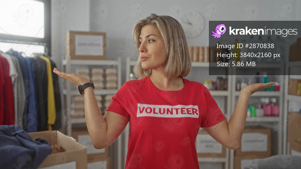 Young blonde woman volunteer wearing red tshirt shrugs both hands in donation center building; uncertainty.