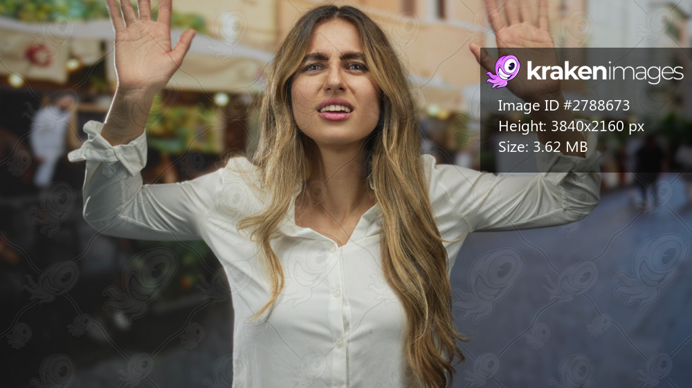 Young blonde woman waves both hands toward camera at outdoor cafe; greeting attention friendliness connection.