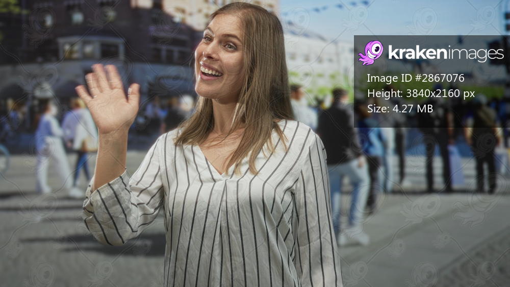 Young blonde woman waves hand at passing pedestrians on busy urban street in daylight; friendly greeting.