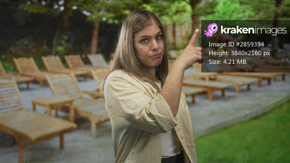 Young blonde woman wearing a beige shirt pointing her index finger upward in forest; serenity curiosity.