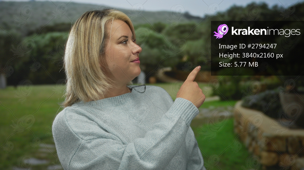 Young blonde woman wearing a light blue sweater points finger to right against green park hedge; confidence guidance direction advice.