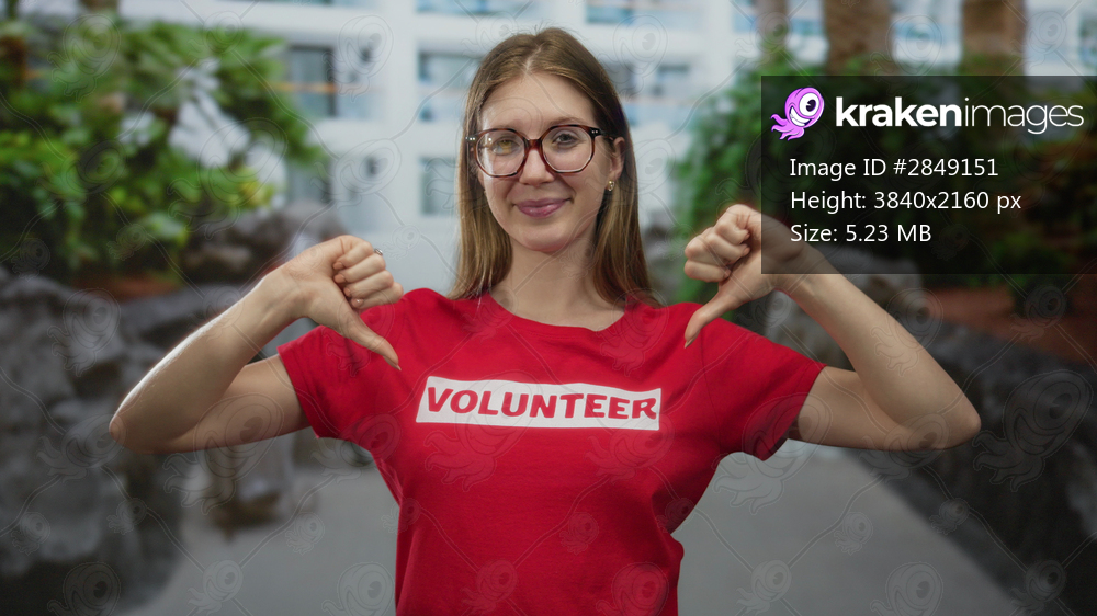 Young blonde woman wearing a red volunteer t shirt pointing thumbs down in a green park setting; disapproval.