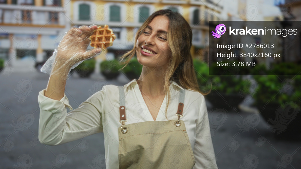 Young blonde woman wearing apron holds waffle near eye with gloved hand in european city square; playful enjoyment fun.
