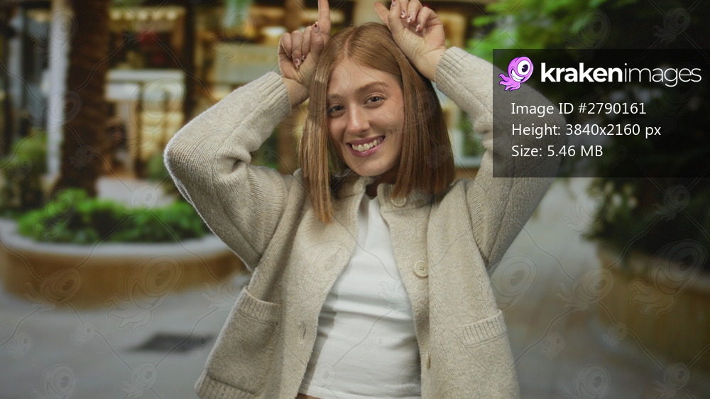Young blonde woman wearing beige cardigan makes horns gesture with fingers on street; rock fun metal.