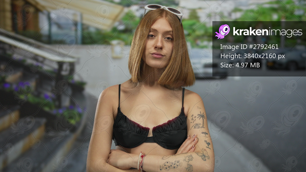 Young blonde woman wearing bikini top pointing finger in street; confidence attitude defiance empowerment.
