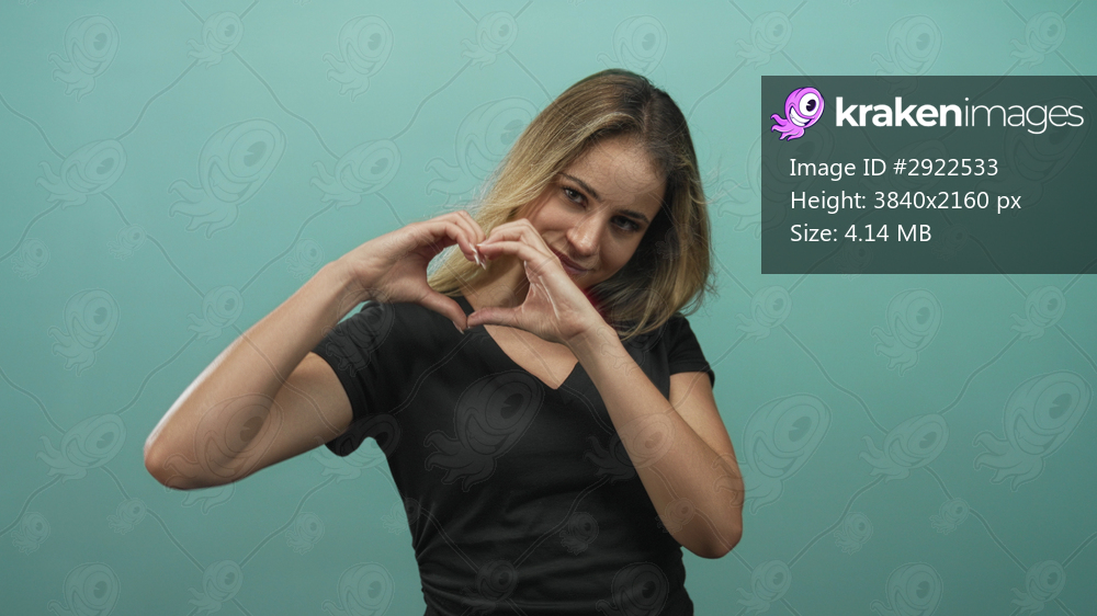 Young blonde woman wearing black t shirt smiling and forming heart shape with hands in studio against teal backdrop; love connection joyful.