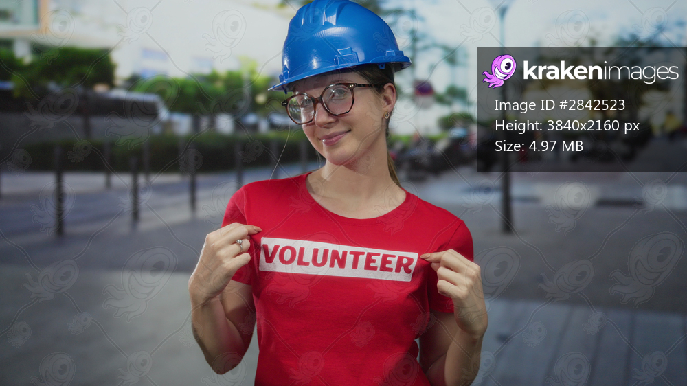 Young blonde woman wearing blue hardhat points finger to volunteer shirt in city street; enthusiasm.