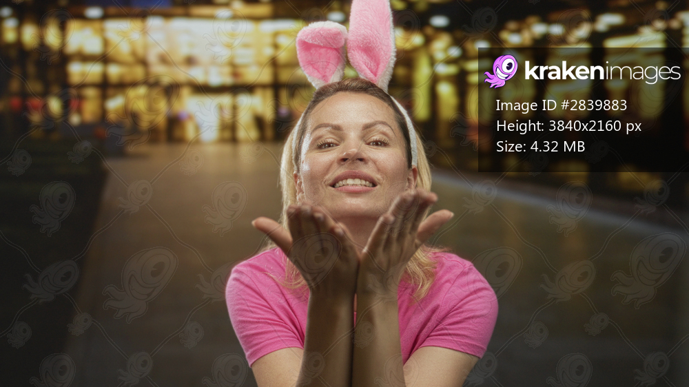 Young blonde woman wearing bunny ears and pink shirt clapping and blowing kiss on city street at night; affection.