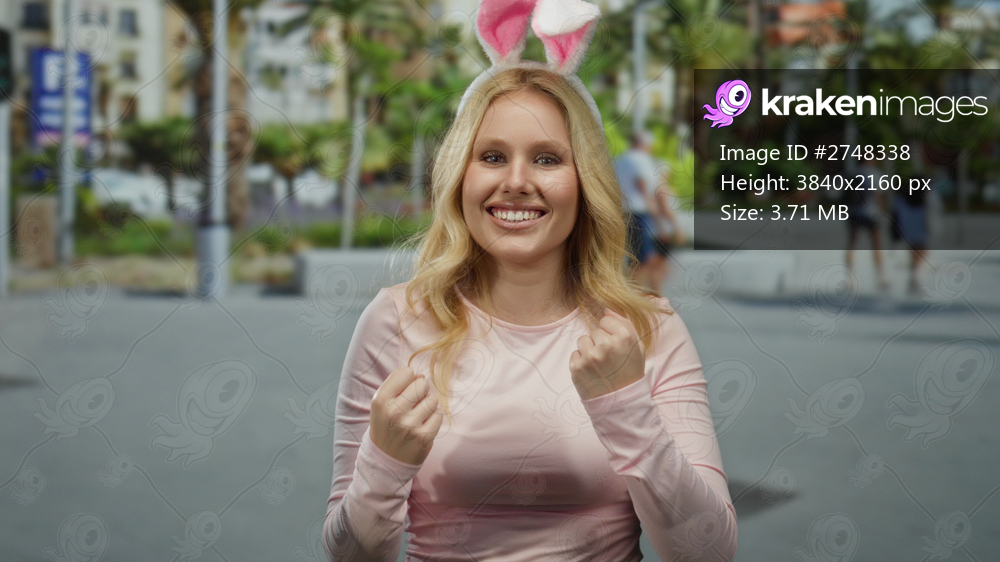 Young blonde woman wearing bunny ears smiling outdoors on a city street, embodying a joyful and funny atmosphere with blurred pedestrians in the background. - Kraken Images