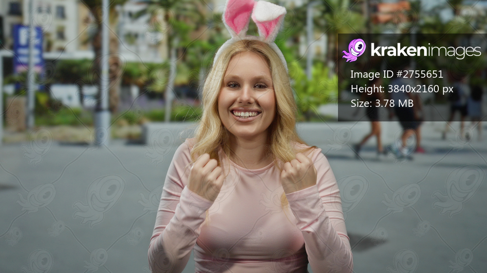 Young blonde woman wearing bunny ears smiling outdoors on a city street, embodying a joyful and funny atmosphere with blurred pedestrians in the background. - Kraken Images