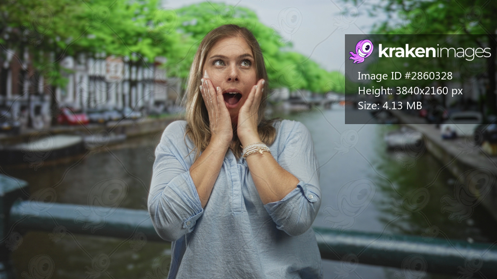 Young blonde woman wearing casual blouse with hands on cheeks gesture in daylight on street; amazement.