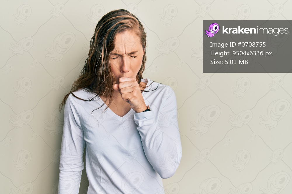 Young blonde woman wearing casual clothes feeling unwell and coughing as symptom for cold or bronchitis. health care concept.