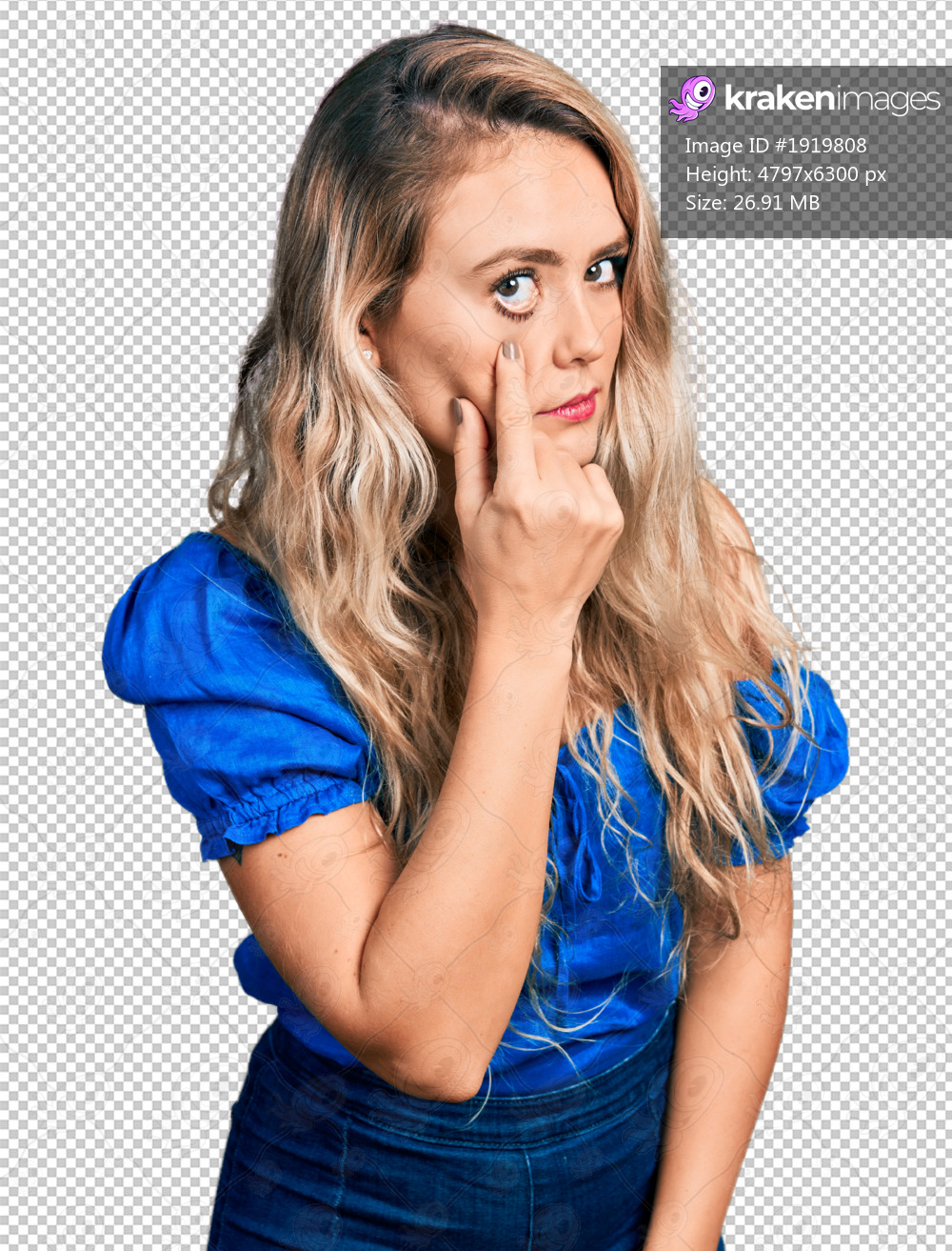 Young blonde woman wearing casual clothes pointing to the eye watching you gesture, suspicious expression