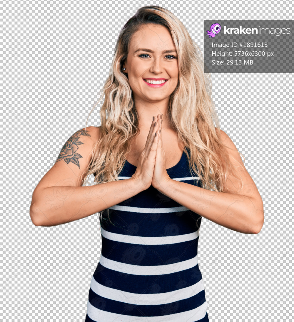 Young blonde woman wearing casual clothes praying with hands together asking for forgiveness smiling confident.