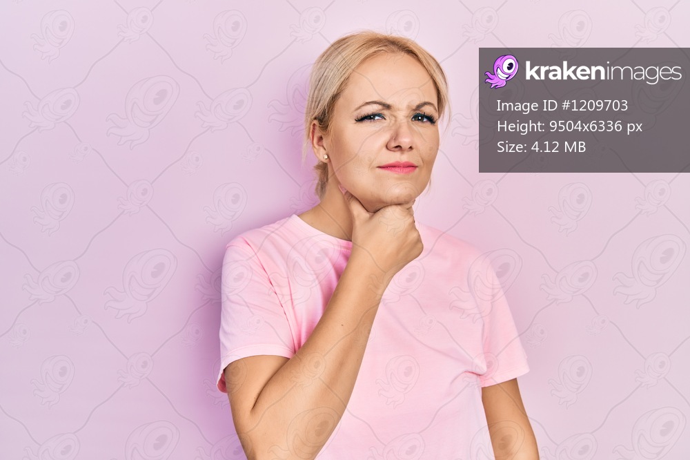 Young blonde woman wearing casual pink t shirt touching painful neck, sore throat for flu, clod and infection