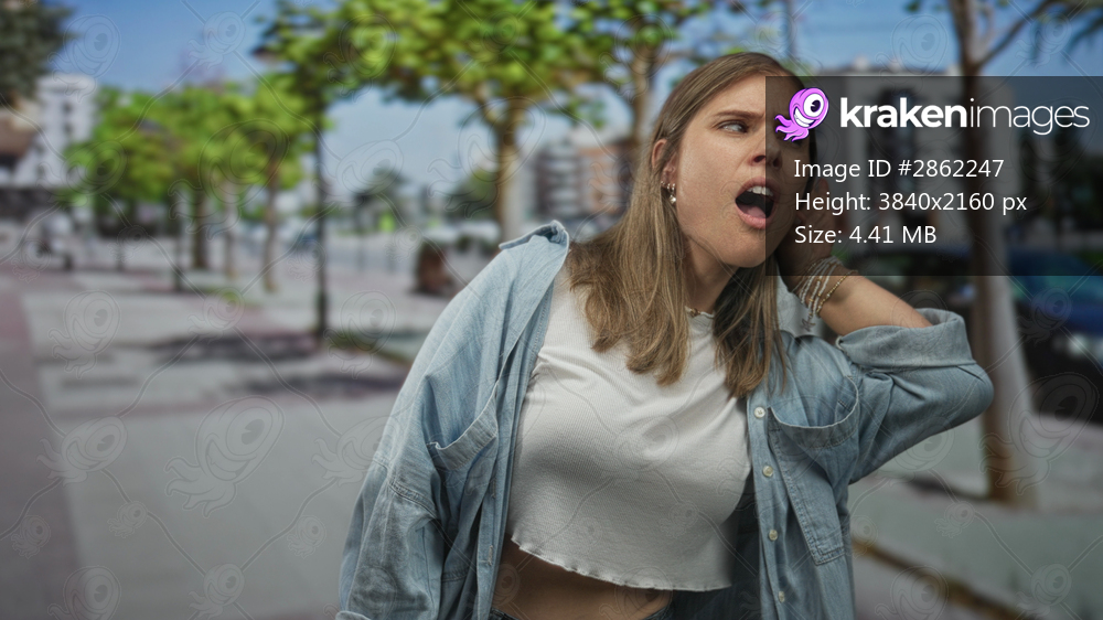Young blonde woman wearing denim jacket cupping hand behind ear on sunlit city street; curiosity listening.