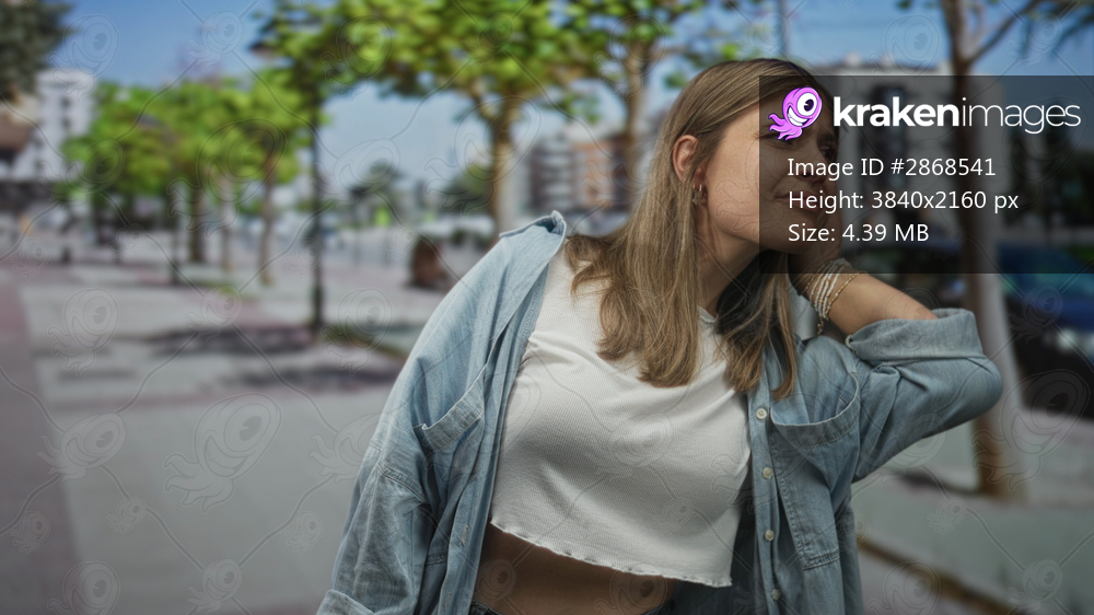 Young blonde woman wearing denim jacket cupping hand behind ear on sunlit city street; curiosity listening.