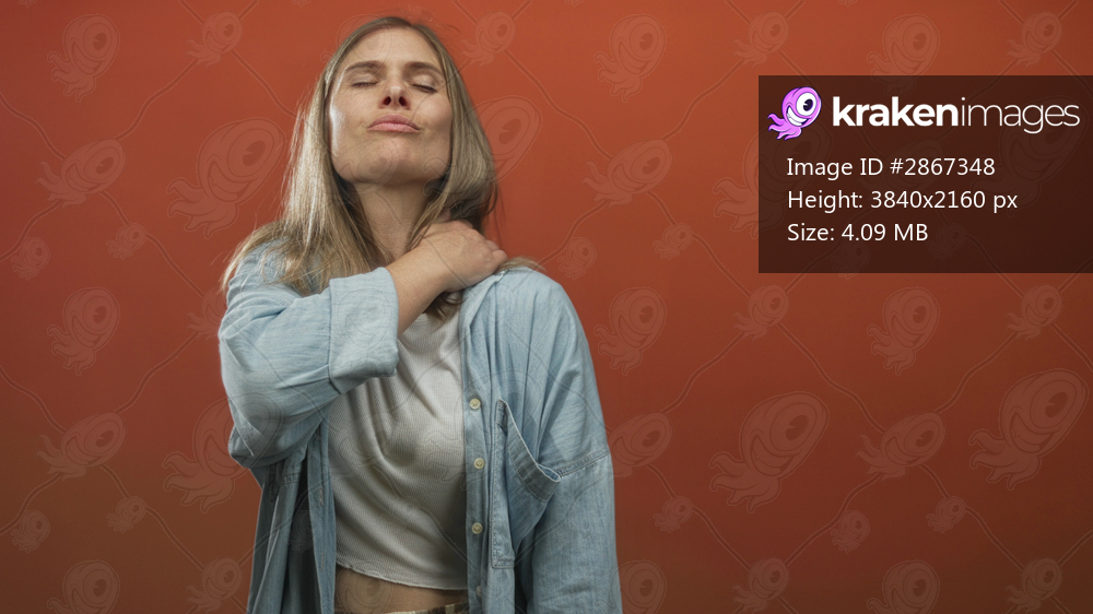 Young blonde woman wearing denim shirt over white top grips shoulder in studio with orange wall and closed eyes; discomfort.