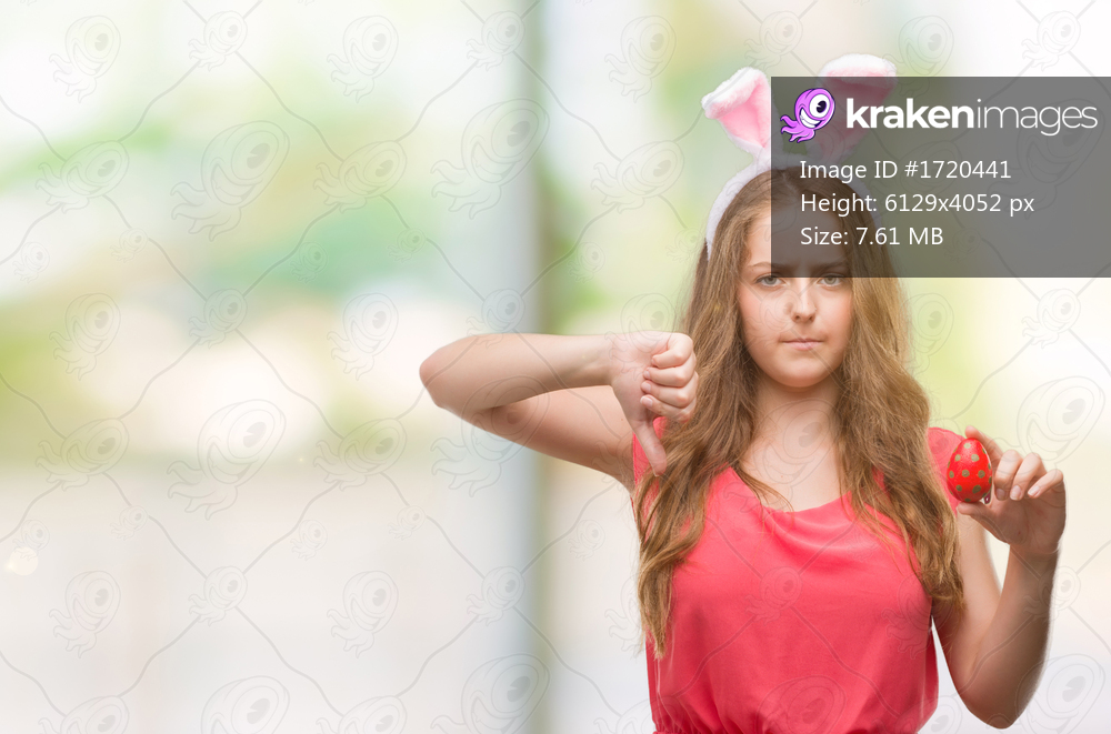 Young blonde woman wearing easter bunny ears with angry face, negative sign showing dislike with thumbs down, rejection concept