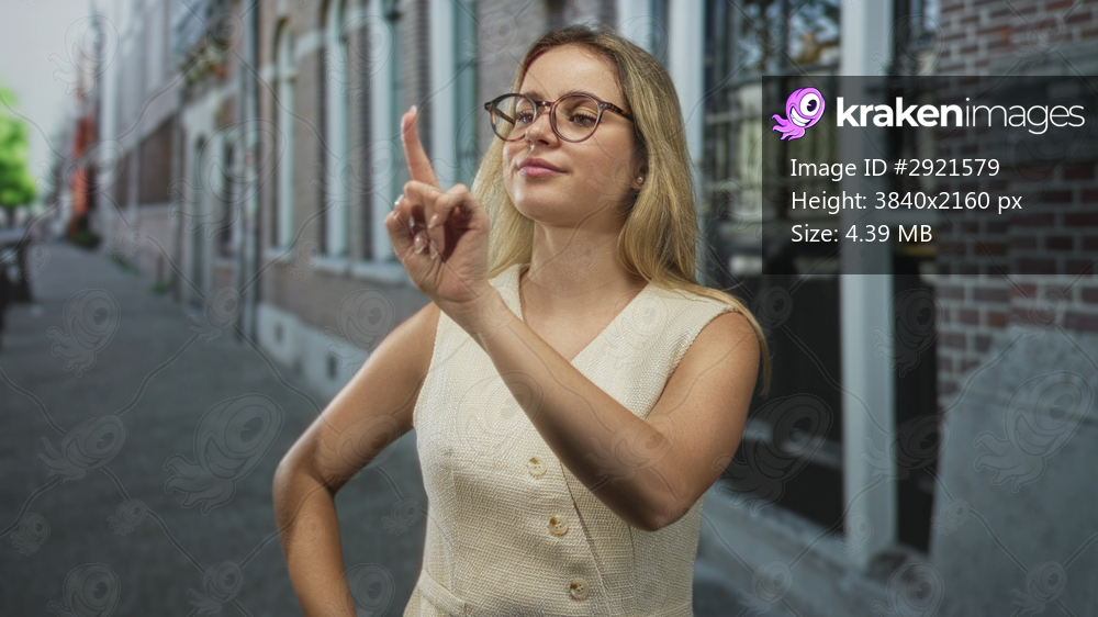 Young blonde woman wearing glasses and a sleeveless cream vest points index finger forward on a city street with brick buildings visible; confidence.