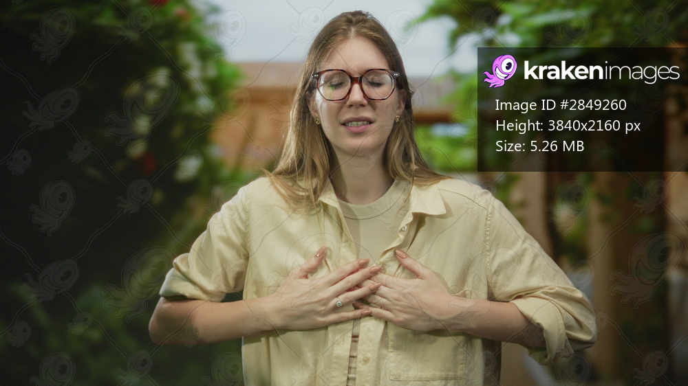 Young blonde woman wearing glasses with closed eyes clutches chest on sunlit forest path amid lush greenery; pain distress.