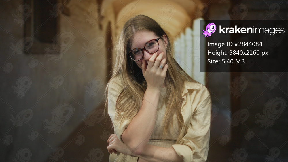 Young blonde woman wearing glasses covers mouth laughing in old town building corridor; joy amusement.