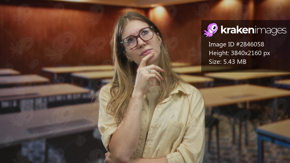 Young blonde woman wearing glasses with finger on chin for thinking in an indoor classroom; quiet contemplation.