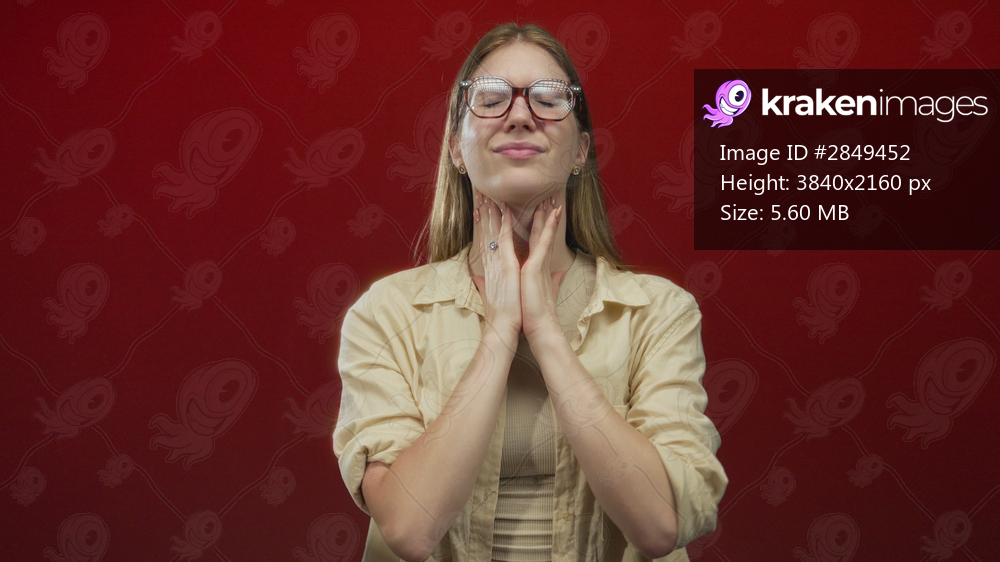 Young blonde woman wearing glasses gently touches her throat in a vibrant red studio under soft light; relief.