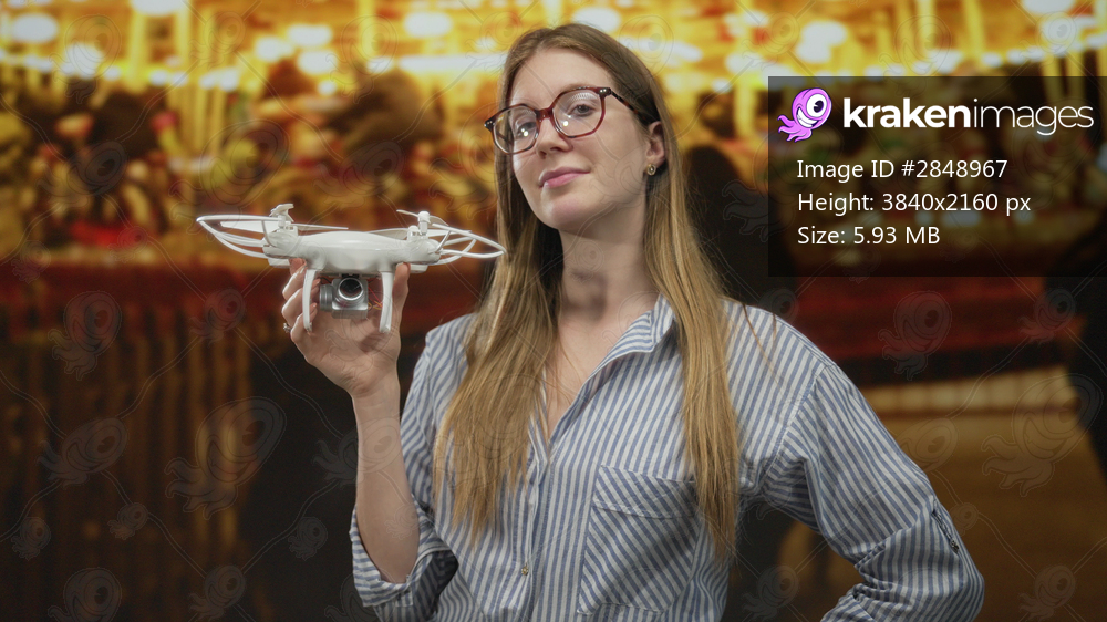 Young blonde woman wearing glasses holding drone at outdoor fair at night; innovation excitement.