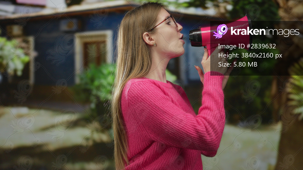 Young blonde woman wearing glasses holding pink megaphone and speaking before building framed by green foliage; empowerment.