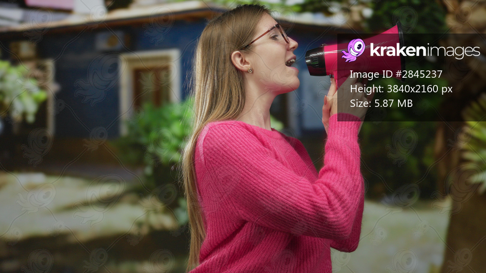 Young blonde woman wearing glasses holding pink megaphone and speaking before building framed by green foliage; empowerment.