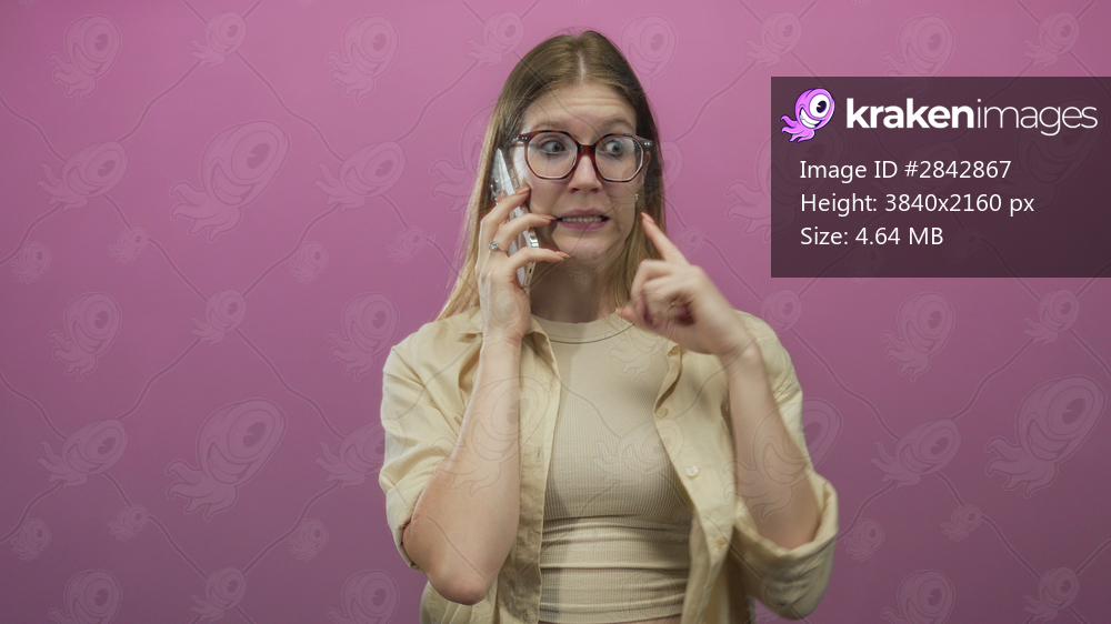 Young blonde woman wearing glasses holds smartphone to ear and points finger at phone in studio; confusion.