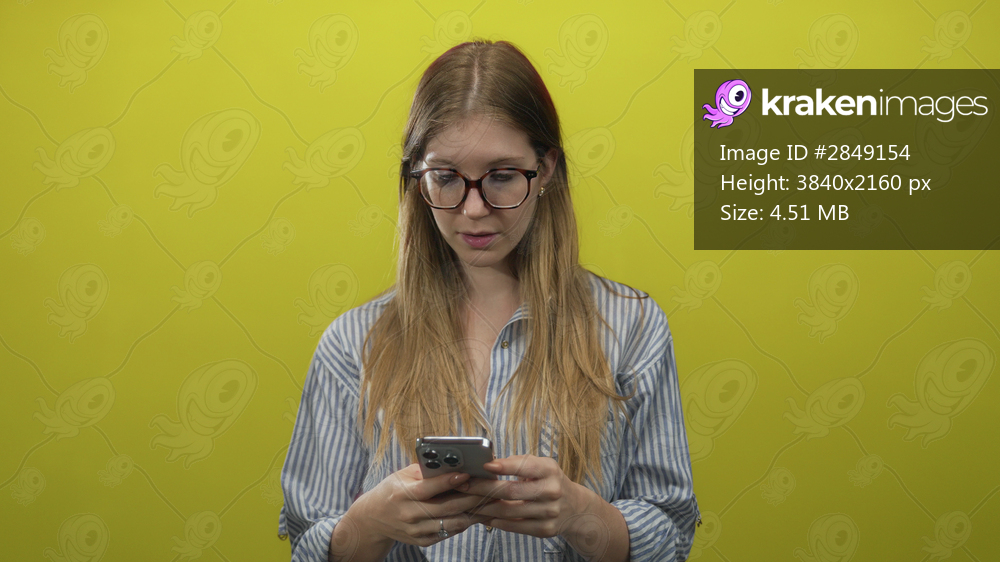 Young blonde woman wearing glasses holds smartphone and touches forehead in yellow studio; frustration.