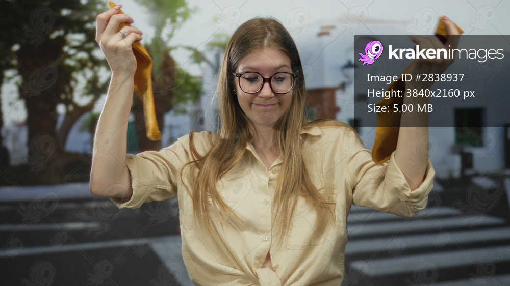 Young blonde woman wearing glasses holds yellow socks up on a street outside a white building; indecision.