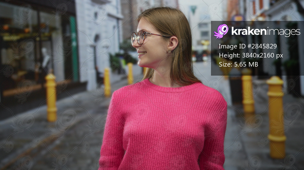 Young blonde woman wearing glasses in pink sweater smiles showing face on cobblestone street in city; happiness.