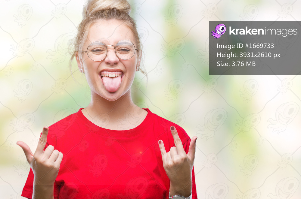 Young blonde woman wearing glasses over isolated background shouting with crazy expression doing rock symbol with hands up. Music star. Heavy concept.
