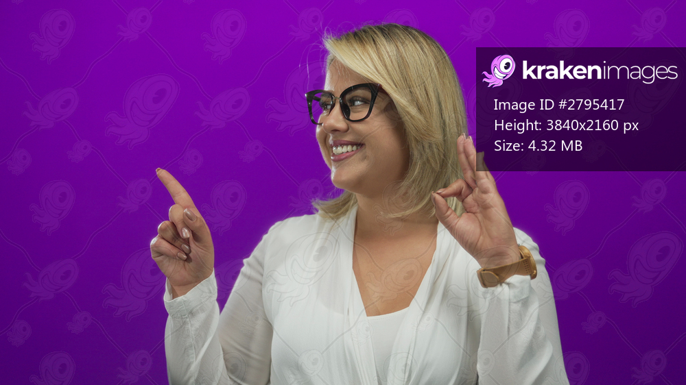 Young blonde woman wearing glasses and white blouse pointing finger sideways and making ok sign in a purple studio; approval.